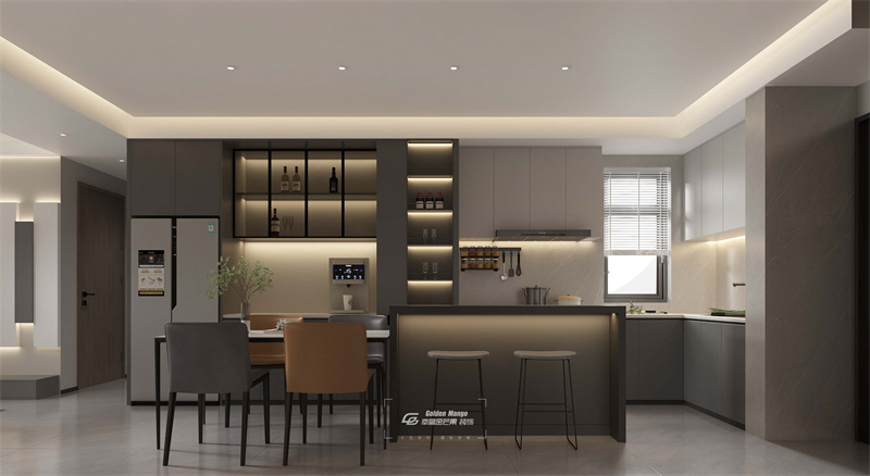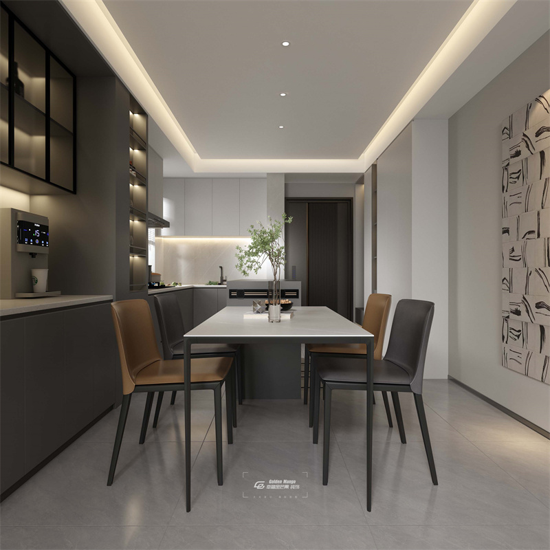 簡約的灰色系廚房,柔和的色調(diào)烹飪變得更加隨心,放松肆意的環(huán)境讓烹飪和用餐變得毫無壓力。餐邊柜用玻璃和燈光點綴,營造出時尚感和溫馨感兼具的廚房。