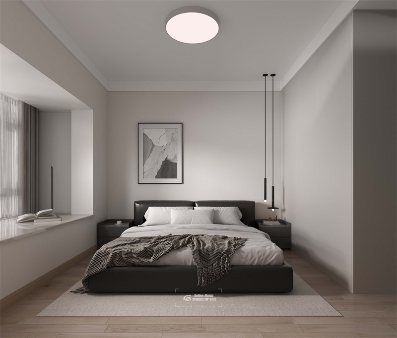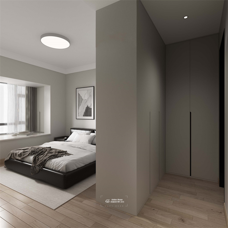 以簡潔的黑白灰色調(diào)裝飾空間,溫馨氣息內(nèi)斂其中,將高級治愈的氛圍呈現(xiàn)于眼前,巧用L型的轉(zhuǎn)角衣柜作為隔斷,提升私密性、滿足空間收納。