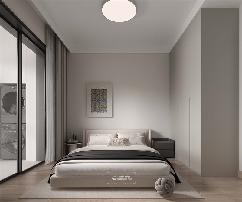 次臥的空間得到了合理利用,采用玻璃門作為隔斷,在功能與美學間達成對生活的多重追求。整體風格極簡,色彩渲染著空間氛圍,讓空間美觀的同時,帶來安靜純粹的舒適感。