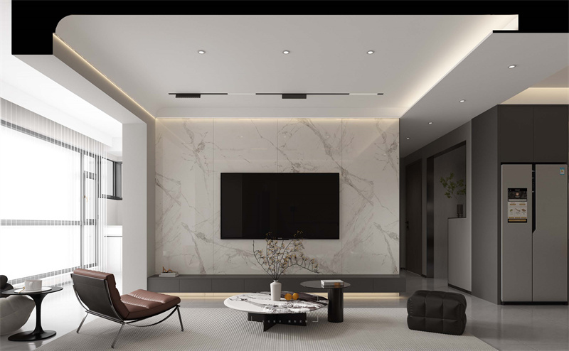 簡約的線條勾勒出氣質(zhì)感滿滿的客廳空間,搭配無主燈設計,就是當代年輕人最愛的氛圍感居家。電視背景墻用一整面石材鋪就,簡約有質(zhì)感的同時,彌漫著文藝氣息。電視柜采用簡約的懸浮款式,搭配氛圍感利器——燈光,不僅顏值爆棚,還能輕松打掃衛(wèi)生。