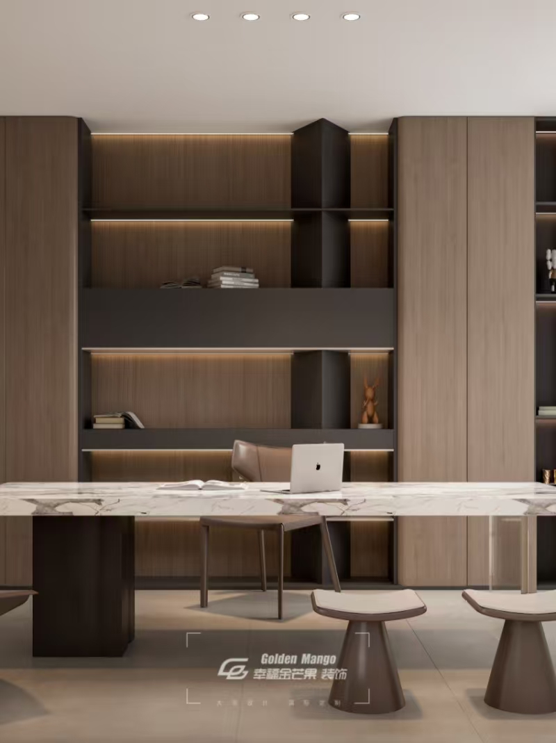 木質書架與巖板書桌對話,利落線條里,藏著專注的力量。開闊空間不設拘束,可伏案深耕,亦可隨性閱讀。嵌入式燈帶柔和灑落,為書頁鍍上暖光,陽光透過百葉簾,在地面跳成光斑。把喧囂隔絕在外,獨享這方沉浸式靜謐,讓思緒在簡雅氛圍里,沉淀出生活的哲思。