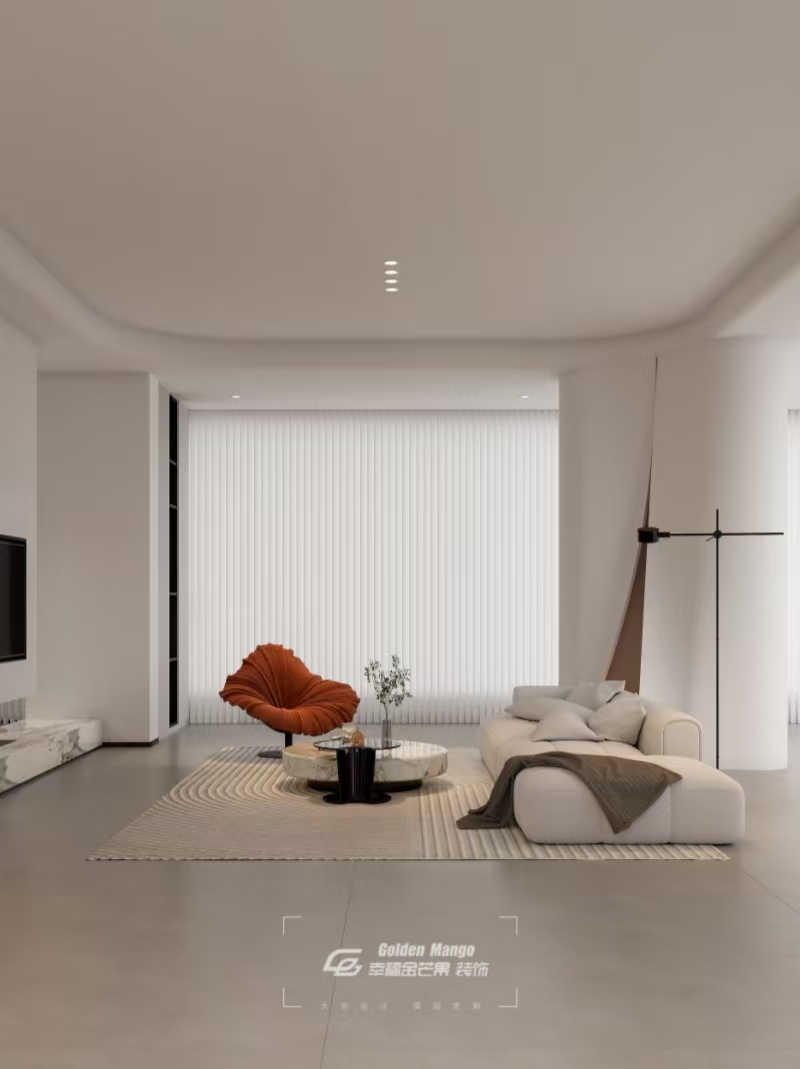 開闊布局打破空間阻隔,客廳、餐廚、景觀區(qū)呼吸相連。家人的笑聲能從廚房飄到沙發(fā),光影在流動空間里肆意生長。巖板地臺、懸浮電視柜勾勒幾何韻律,橙色單人椅是鮮活注腳,靜坐于此,看生活在眼前自然上演,把日常過成永不落幕的溫馨劇場。