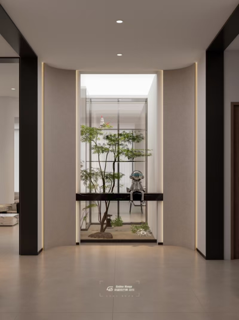 弧形墻體柔化空間棱角,玻璃隔斷框住微型景觀,松石、綠植與藝術擺件共生。踏入玄關,仿佛走進自然與藝術編織的詩意小徑,卸下疲憊,讓家的溫柔,從第一步就緊緊包裹身心,把門外的紛擾,都留在這方小天地之外。
