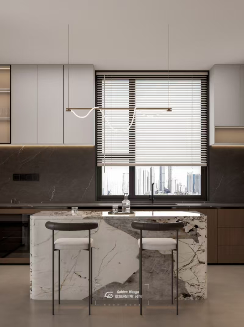 淺灰櫥柜與深灰?guī)r板碰撞,勾勒出利落的幾何線條,中島臺的大理石紋理似一幅流動的山水長卷。垂墜的藝術吊燈,為備餐時光暈染溫馨光暈。百葉窗輕掩,將城市天際線框成窗景,在這里,烹飪不再只是家務,而是與家人分享煙火、品味生活的浪漫儀式,每一次舉杯,都藏著對平凡日常的熱愛。