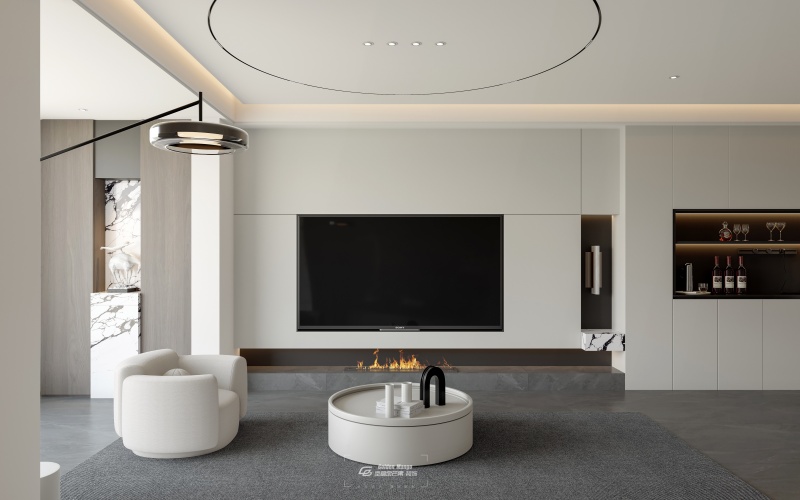 整體簡約規(guī)整,大白墻嵌入巨幕電視,下方嵌入式壁爐添溫馨。一旁柜體結(jié)合開放與封閉收納,陳列酒杯、酒瓶等,兼具實用與裝飾。白色單人沙發(fā)呼應(yīng)風(fēng)格,天花板圓形線條延續(xù)空間設(shè)計語言,營造簡潔大氣且有生活感的環(huán)境。