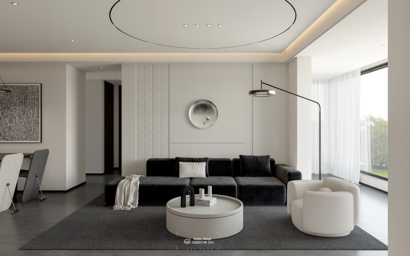 以黑白灰為主色調(diào),簡潔大方。黑色 L 型沙發(fā)搭配淺色抱枕、毛毯,柔和空間。圓形白色茶幾造型簡約,上方小擺件增添精致感。