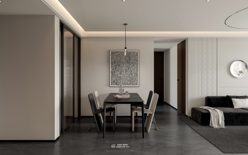 色調(diào)沉穩(wěn),深灰餐桌搭配黑白椅子,簡潔利落。上方單盞吊燈簡約現(xiàn)代,墻面大幅藝術(shù)畫豐富視覺。一側(cè)推拉門節(jié)省空間,另一側(cè)可看到客廳部分區(qū)域,空間過渡自然,營造出簡約又具藝術(shù)氛圍的用餐環(huán)境。