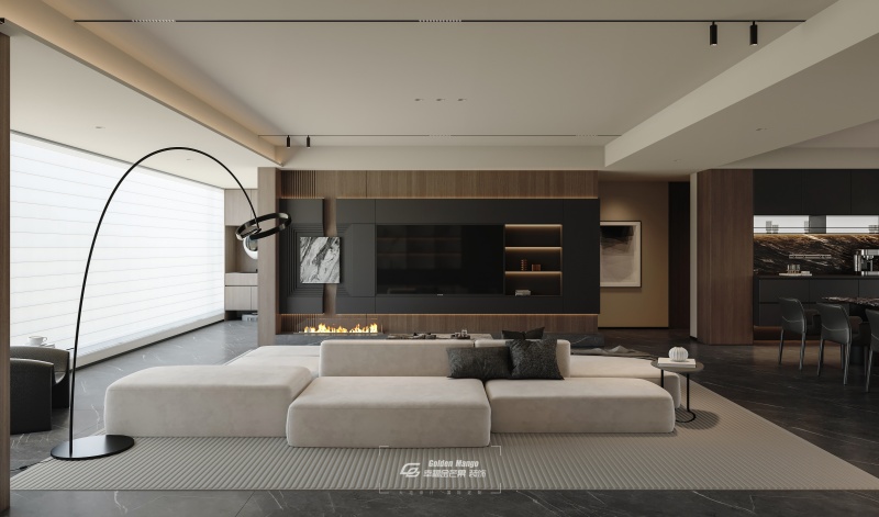 踏入客廳,便被其通透開(kāi)闊的格局所震撼。墻面以黑、白、木三色為主基調(diào),通過(guò)簡(jiǎn)潔的線條與色塊劃分,勾勒出極具現(xiàn)代感的視覺(jué)效果。