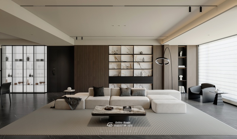 黑色地磚與灰色地毯的搭配,低調(diào)中透著奢華,而淺色沙發(fā)搭配不規(guī)則大理石茶幾,圍合出一個(gè)溫馨而時(shí)尚的交流空間。落地窗引入充足自然光,光影交織間,讓整個(gè)空間充滿生機(jī)與活力。