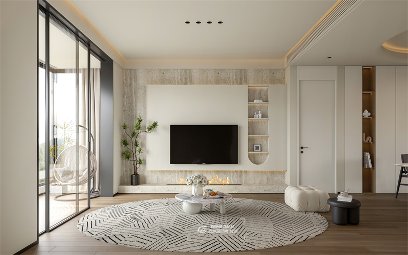 空間以 “淺色系 + 木質(zhì)肌理” 為基底,弱化了現(xiàn)代風(fēng)格的冷硬,多了份松弛親和:造型圓潤(rùn)的白色沙發(fā)像一朵 “云”,慵懶地承接生活的閑逸;黑白紋理的圓形地毯如藝術(shù)畫(huà)布,為空間錨定 “隨性又精致” 的基調(diào)。