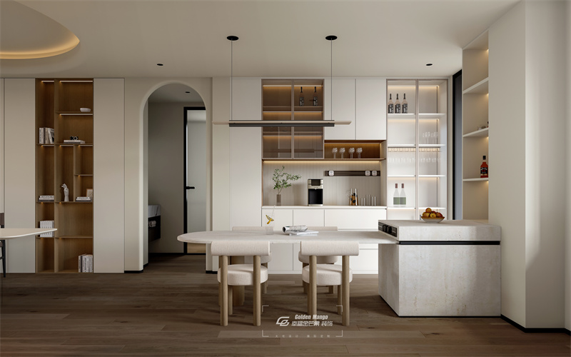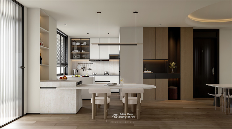 餐廚區(qū)采用開(kāi)放式設(shè)計(jì),讓空間感徹底解放。餐廳里,圓形餐桌柔化了線(xiàn)條棱角,搭配簡(jiǎn)約長(zhǎng)吊燈,“儀式感” 悄然流露;一旁的中島臺(tái)是 “多面手”—— 既是料理時(shí)的輔助臺(tái),也是家人小聚的 “咖啡角”,擺上鮮果、杯盞,生活的小確幸便在光影里流轉(zhuǎn)。