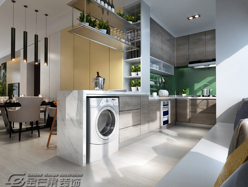 ▲ 廚房設(shè)計(jì),設(shè)計(jì)師打通了原廚房布局,和生活陽臺(tái)打通,設(shè)計(jì)的開放式廚房,有情調(diào)的吧臺(tái)把廚房餐廳相融合,使整個(gè)空間開闊,明亮。