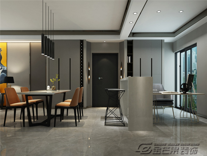 整個(gè)空間采用大量的灰色系元素,極簡(jiǎn)的樣式與深沉凝練的紋理,大氣而干練讓空間充滿著高度成熟而內(nèi)蘊(yùn)的意趣。設(shè)計(jì)師考慮到客餐廳比較寬闊,在原餐廳處增設(shè)輕食吧臺(tái),為餐廳空間營造了不同的生活情趣。