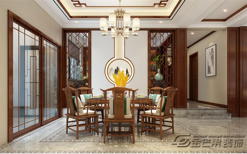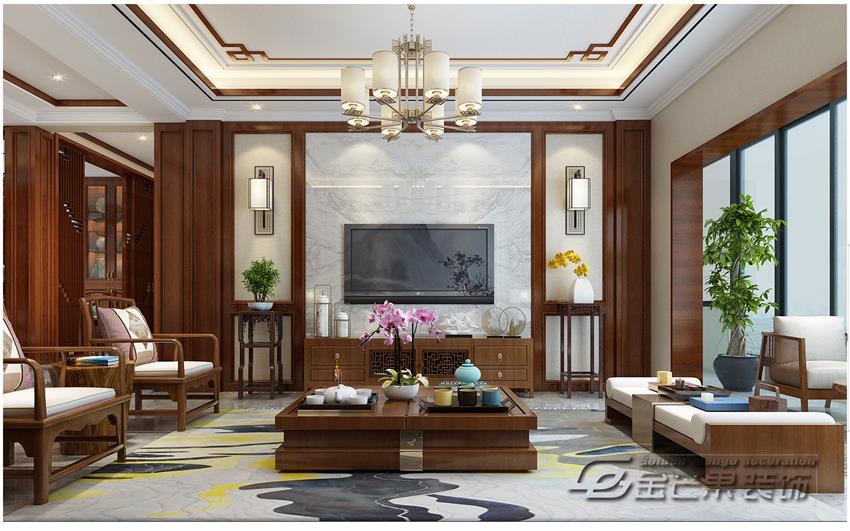 承襲中國傳統(tǒng)對稱美,屏風等元素。在此基礎上搭配現(xiàn)代地板磚、燈飾等。采用實木家具配合瓷器飾品,再加墻上的山水畫,形成清新淡雅又大氣磅礴的客廳風格。