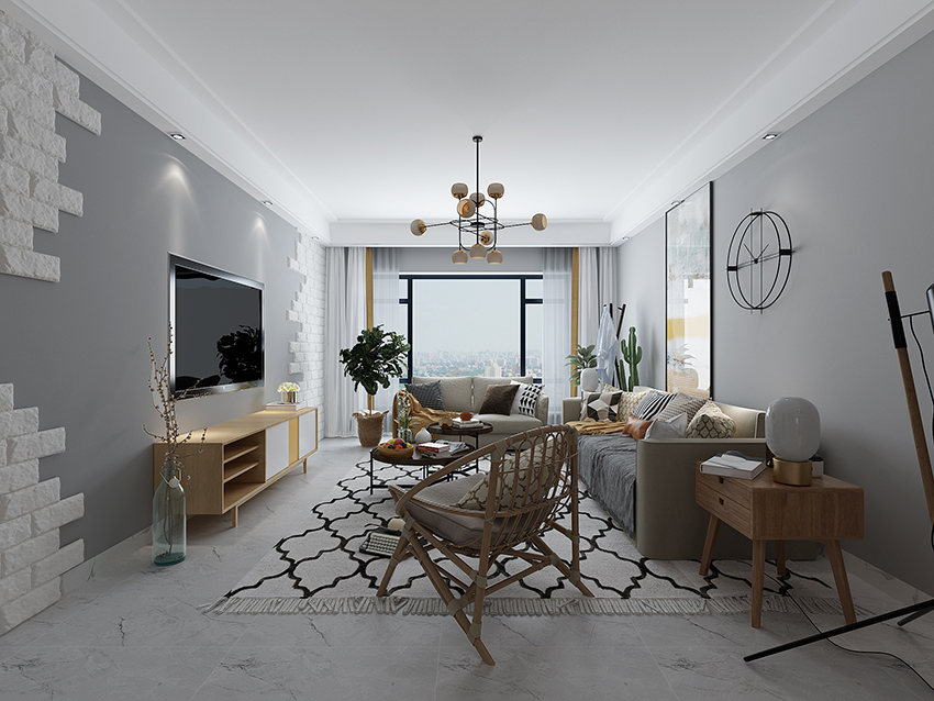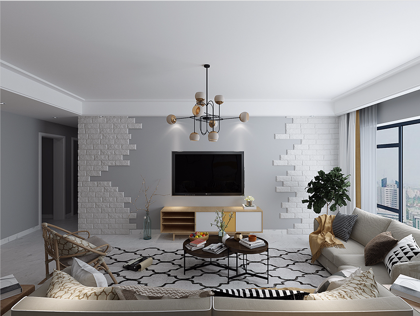 在客廳的設(shè)計(jì)中尤其突出設(shè)計(jì)的用心,客廳以灰色為背景,頂色依舊為經(jīng)典的白色,百色磚貼在兩邊錯(cuò)落有致,立體吊燈和鑲在墻內(nèi)的電視更是增強(qiáng)了客廳的空間效果。窗簾則選用三層,為了搭配整體效果最外層選用白色,中間的一層則是主要的遮光作用,干凈利落體現(xiàn)無疑。