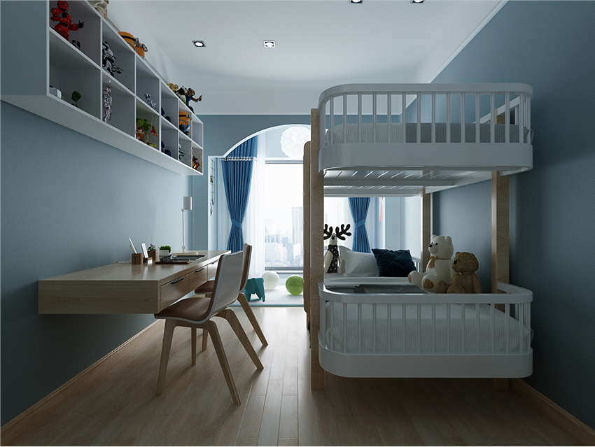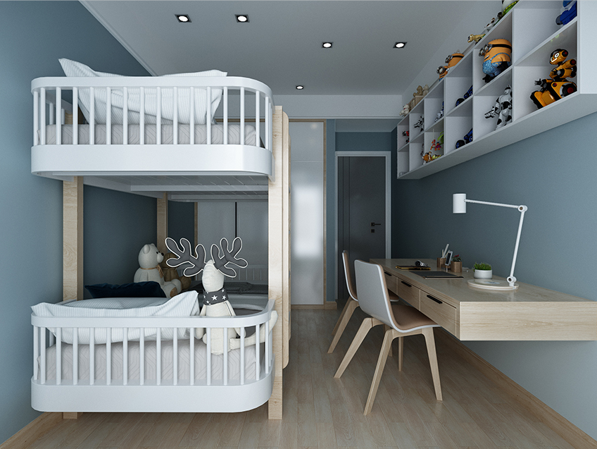 兒童房則選用高低床經(jīng)濟(jì)實(shí)用的同時(shí)又美觀。桌臺簡潔大方,收納格子放滿玩具人物的模型,孩子每天起床映入眼簾的正是這些精美模型,愉快的一天就此開始,錯(cuò)落的射燈保護(hù)孩子眼睛,又有一種星空般的感覺。小陽臺則主要以娛樂玩耍為主。真正的休息、學(xué)習(xí)、玩耍三不誤。