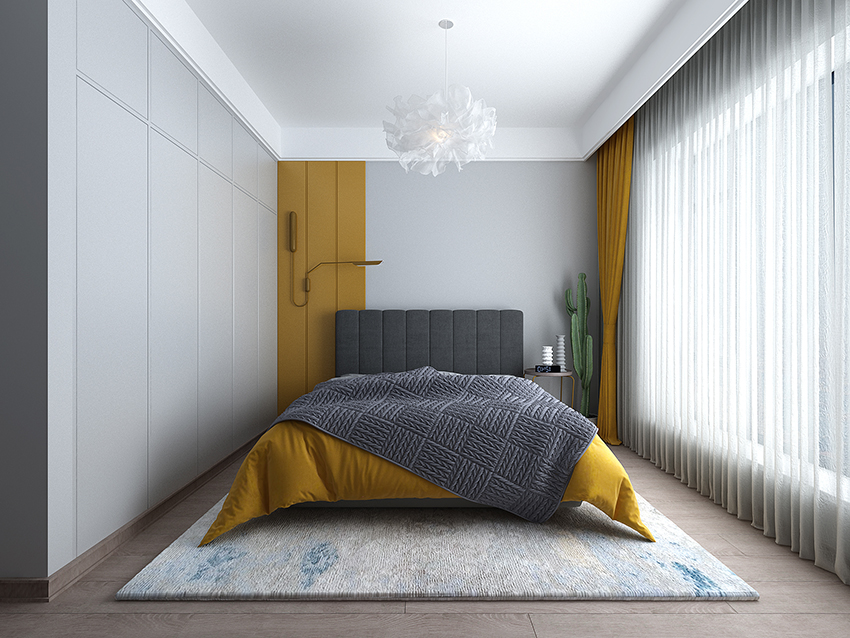 臥室整體以灰、白為基準(zhǔn)色調(diào),床頭位置則以深黃色點(diǎn)綴,這也是驚喜所在,當(dāng)你晚上或者你想休息時(shí)拉上窗簾會發(fā)現(xiàn)深黃色變成了主要的顏色,溫暖而實(shí)在,從而入睡一整夜。巨大的衣柜則是讓你隨心買,我隨心裝。吊燈也是增添了幾分藝術(shù)氣息。