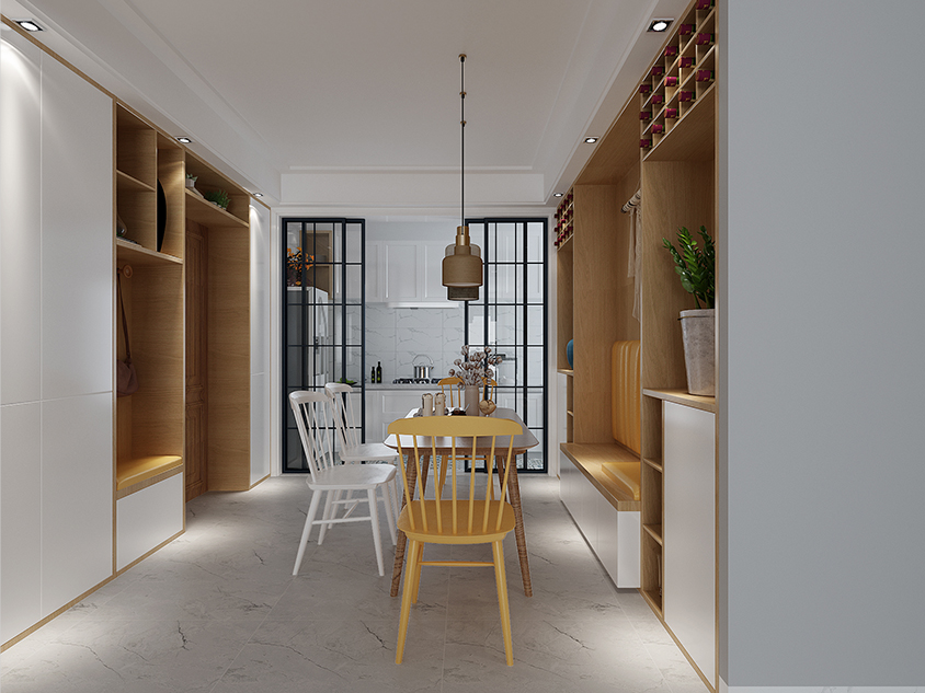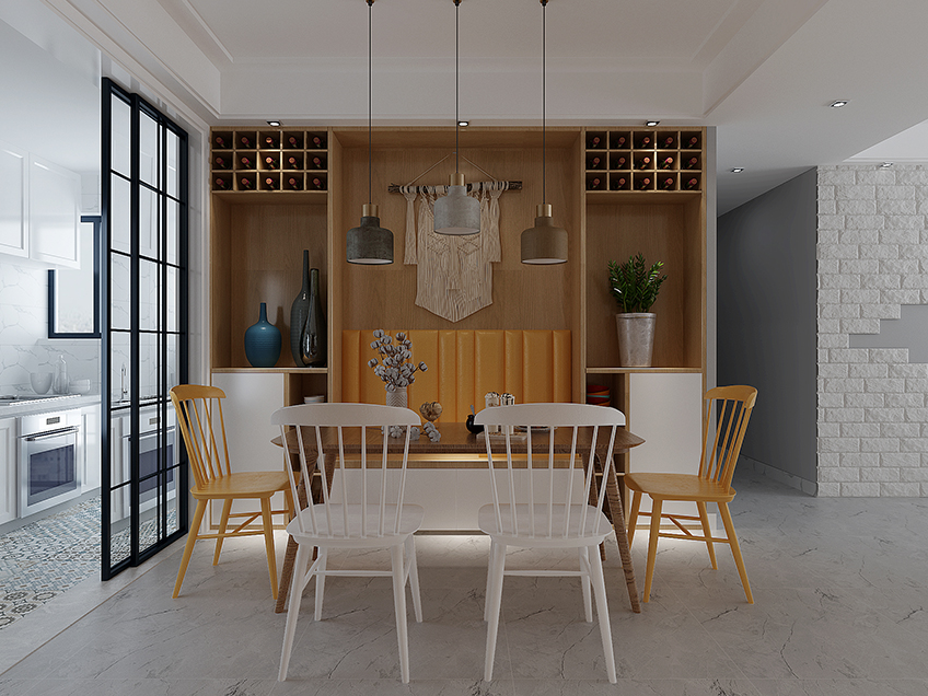 廚房和用餐區(qū)則以格子透明的玻璃推拉門巧妙的隔開,廚房整體呈現(xiàn)白色,上下兩層收納柜可以放下你足夠多的廚具和餐具。如果說白色搭灰色是積極、活潑的,那么黑色的門框則表現(xiàn)得沉著、穩(wěn)重和冷靜。擺滿格子的酒是和遠(yuǎn)道而來的朋友小酌一杯的底氣所在,也是夫妻兩人一品紅酒的浪漫所在,整個(gè)用餐的地方也加入許多線條的元素。