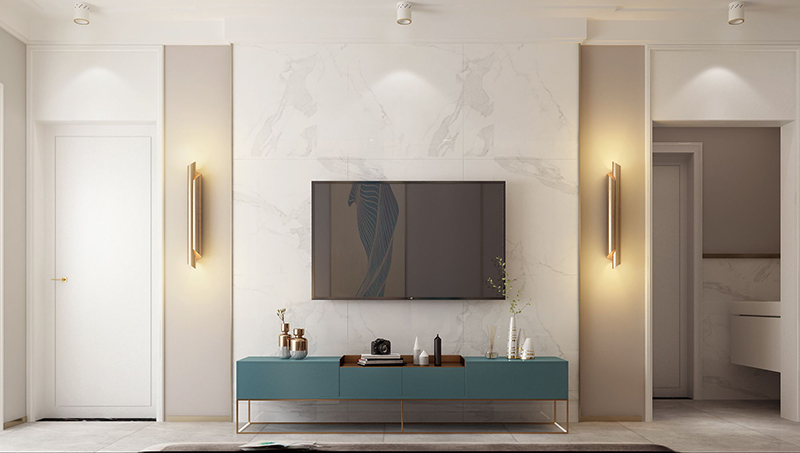 電視背景墻以帶有紋理的白色大理石為背景經(jīng)久耐看,兩邊的燈飾加上大理石顯現(xiàn)出高端而優(yōu)雅,電視柜側(cè)重表現(xiàn)北歐元素,簡潔大方、實用而美觀。