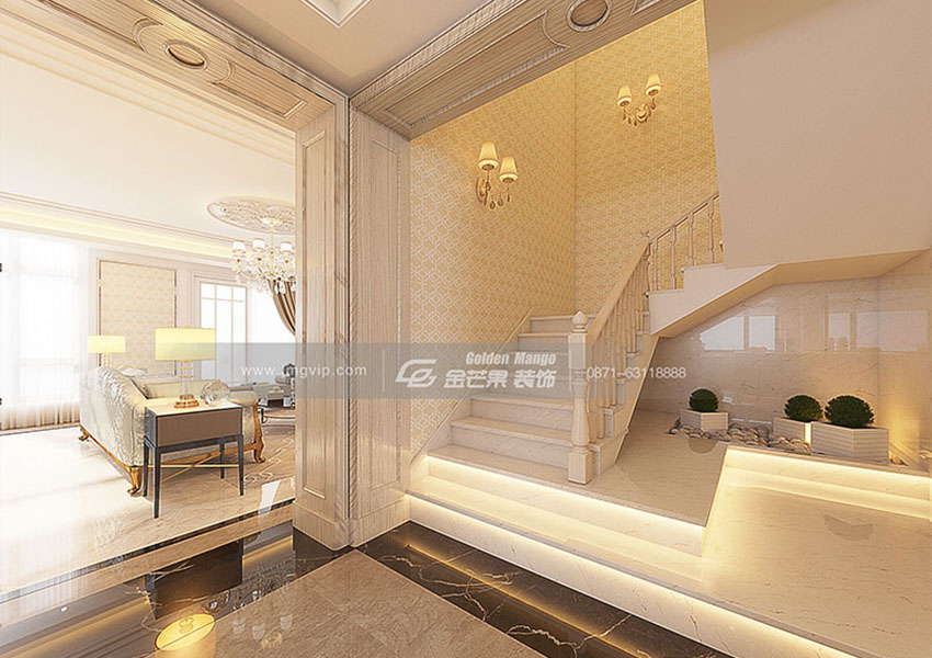 細節方面也恰到好處,樓梯安裝兩盞壁燈,邊角裝飾的燈帶顯得浪漫、撩人。金色打邊的桌子再次散發巴洛克氣息。優雅的線條穿透著整體。