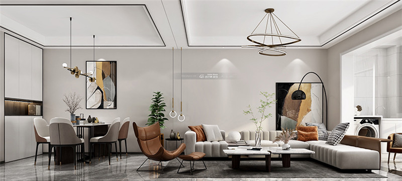 開放的客餐廳,大氣簡潔的設計讓家居空間變得自由且氣質,中間用燈飾作為區域的分隔,讓客餐廳既有互動也區別開來。